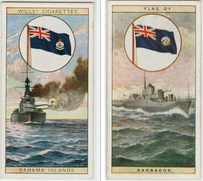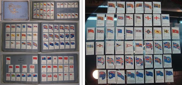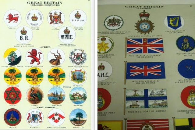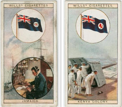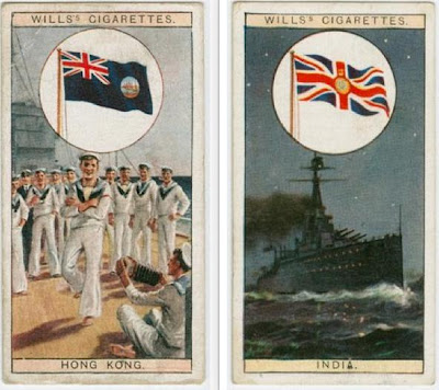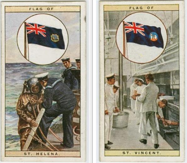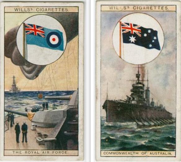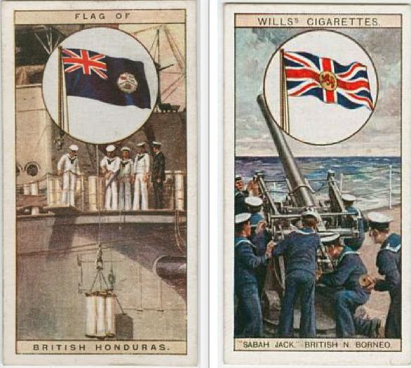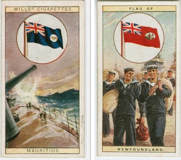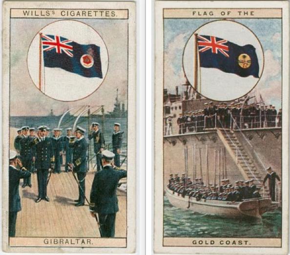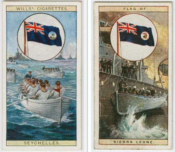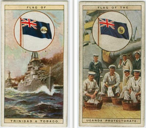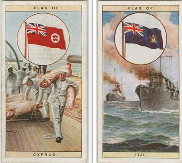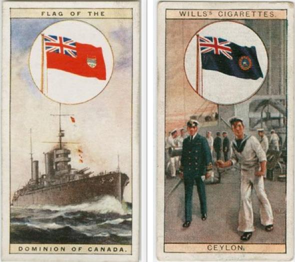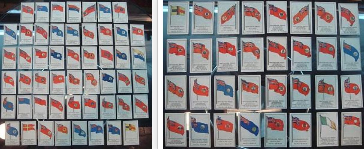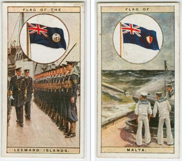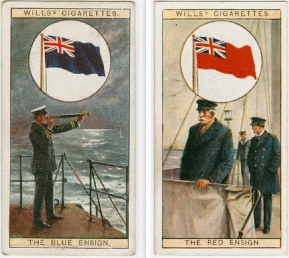 Left: 1895 Chart entitled Flags of the British Empire showing the Blue Pendant & White Pendant and the following flags: Royal Naval Reserve, Lloyd’s ensign, Man o’ War, Board of Trade Marine Department, The Royal Standard, Custom House, Governor General of Colonies, St George’s Cross, British India, Dominion of Canada, Union Flag, Newfoundland, Cape Colony, Natal, Merchant Red Ensign, Commonwealth of Australia and the Dominion of New Zealand. Right:Wills in 1908 entitled Flags & Ensigns. Includes White Ensign, Strait Settlements, Sandwich Islands, Governor General of Colonies, Custom House, British Empire Admiralty Vessels, Board of Trade and Blue Ensign.