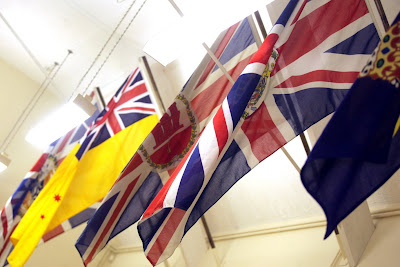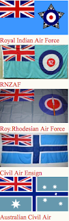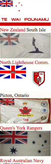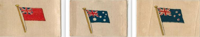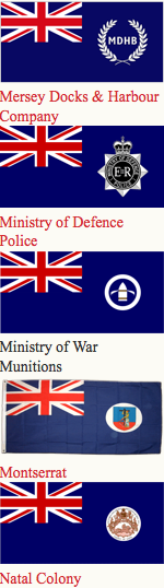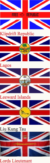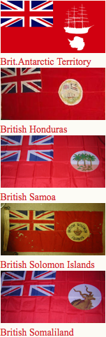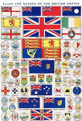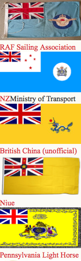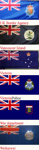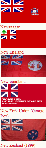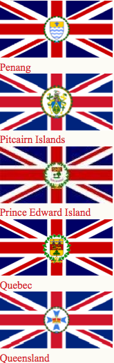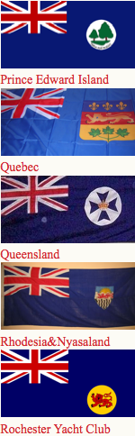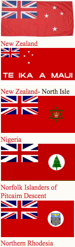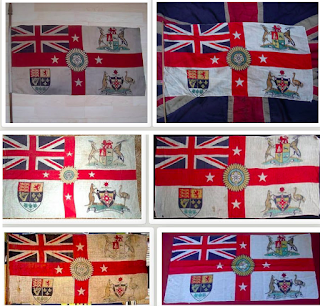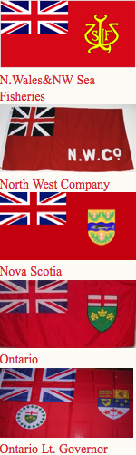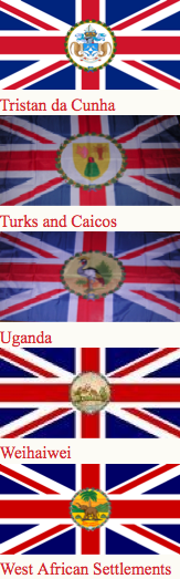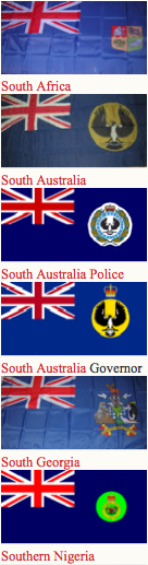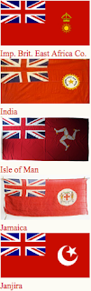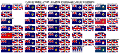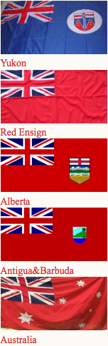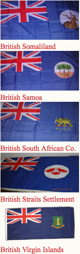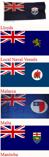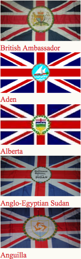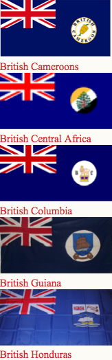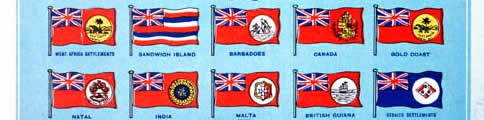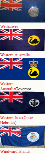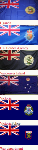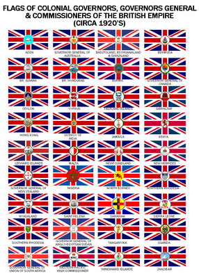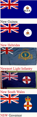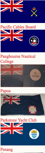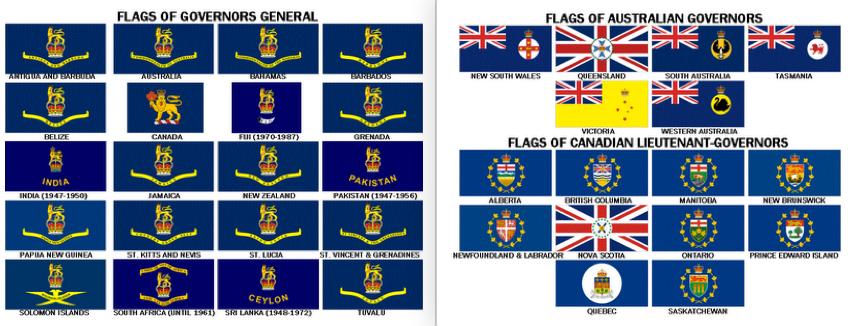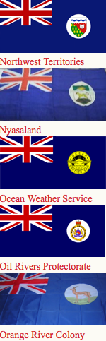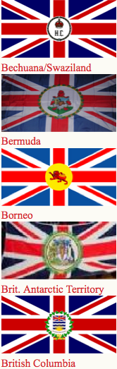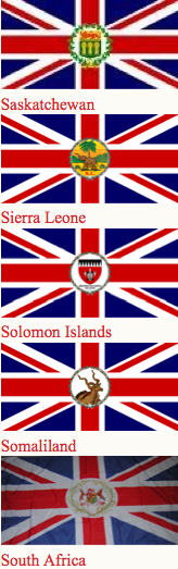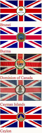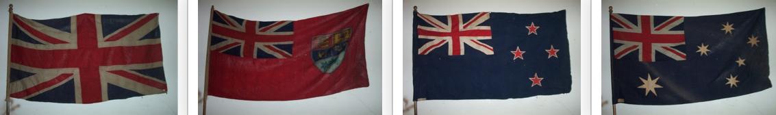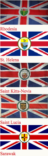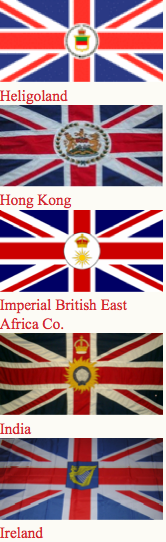 Canadian ensign (1892-1922), an apparent Indian Viceroy's flag, an unknown African Governor's flag and Australia