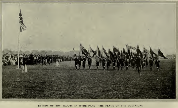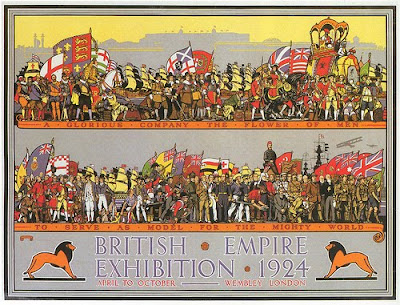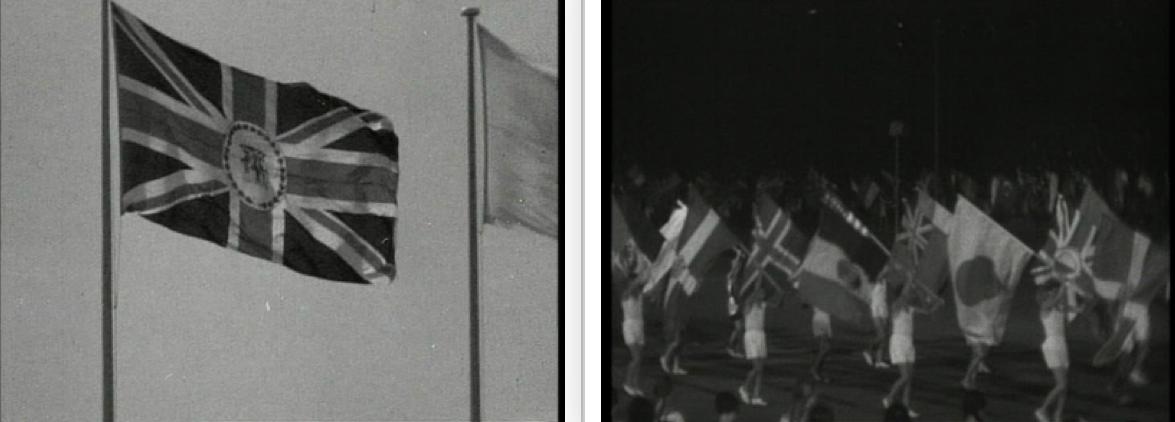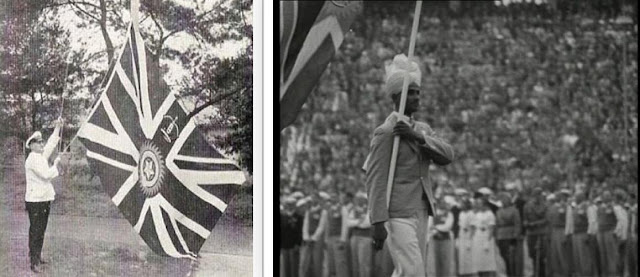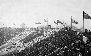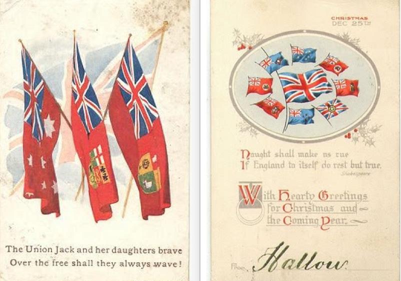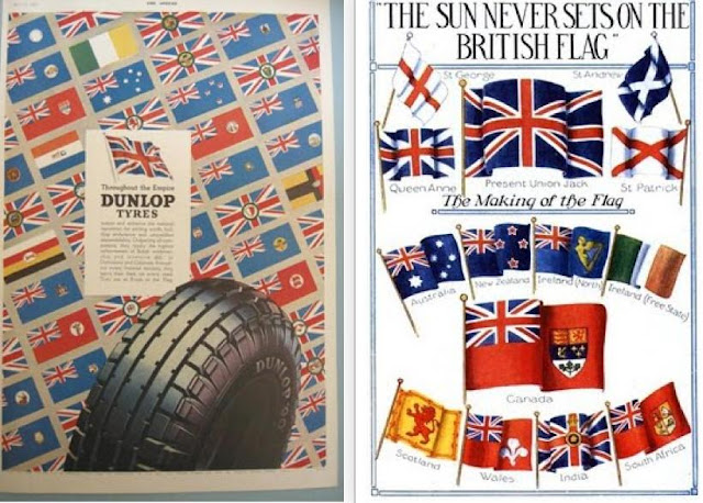 Belfast in 1906 with the Canadian, Australian (earlier version with all stars in the Southern Cross seven-pointed apart from the smallest and the Commonwealth Star which didn't become 7 pointed until 1908) and Irish ensigns and, on the right, at the opening of the British Empire Exhibition in April 1924 in Wembley Stadium. Inexcusably, the Union flag is flying upside down.