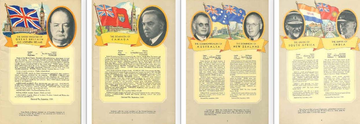 20 pages, by Gutta, Percha & Rubber Co., lithographed in Toronto, 19 countries listed with leader portraits and scenic illustrations.