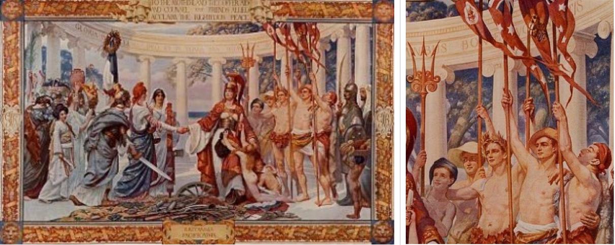 Sigismund Goetze's Britannia Pacificatrix at the Foreign Office showing Britannia victorious after the Great War, upholding the peace with the aid of Her far-off sons and allies within a marble colonnade topped with a Latin inscription. She shakes hands with America, wearing the cap of liberty and holding the scales of justice. She in turn is flanked by France, grasping a short sword pointed downward at the wreckage of Germany's war machine, and Italy, holding the axe and fasces. All stand on the imperial flag of Germany.