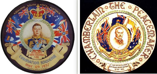 Edward VIII souvenir plaque for the 1937 Coronation which never took place due to the Abdication, featuring portrait of the King in full military dress framed with a crowned wreath, flags of Canada, New Zealand, South Africa, Australia and India around, 152mm. On the right entitled Chamberlain the Peacemaker are shown the flags (from left to right) of New Zealand, India, Dominion of Canada, South Africa and Australia.
