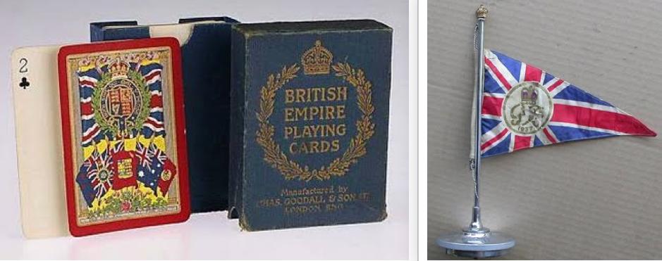 Left: Set of 'British Empire' vintage playing cards featuring the flags of New Zealand, India, Canada, Australia, and South Africa. Right: British flag mascot, dated 1937, made for the Coronation